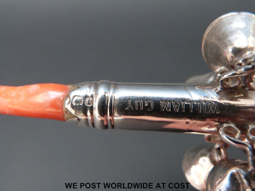 A hallmarked silver coral handled babies rattle, marks indistinguishable, length 14cm