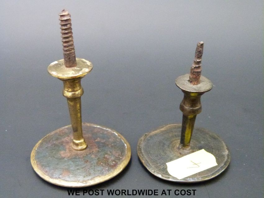 Two 18thC English Bilston enamel cloak pins or chimney piece knobs, one polychrome decorated with a man fishing in a river before a cottage, the other with cattle watering in a river before a church