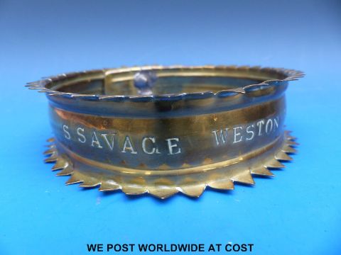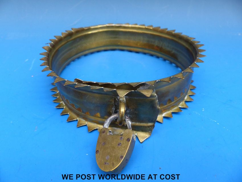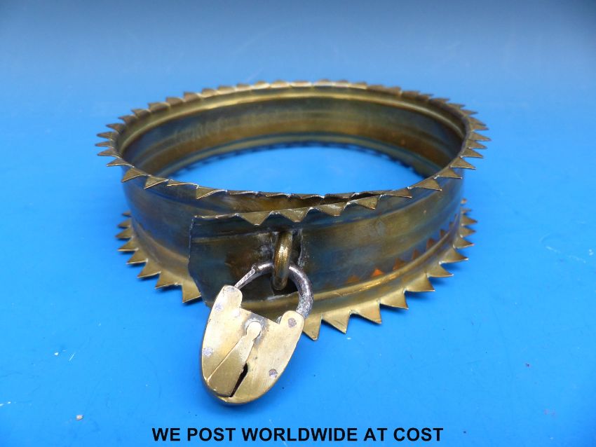 A Victorian brass dog collar with period padlock, sharp outward pointed serrated decoration and engraved 'S. Savage Weston Point' (diameter 14cm)