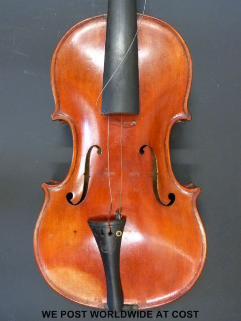 A 20thC violin labelled Leon Mougenot Gauche (36cm back)