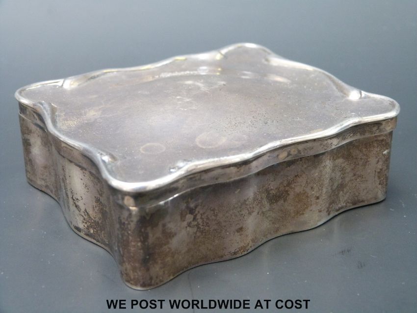 A hallmarked silver shaped ring box with fitted plush interior, Birmingham 1910, maker A & J Zimmerman (width 9cm)