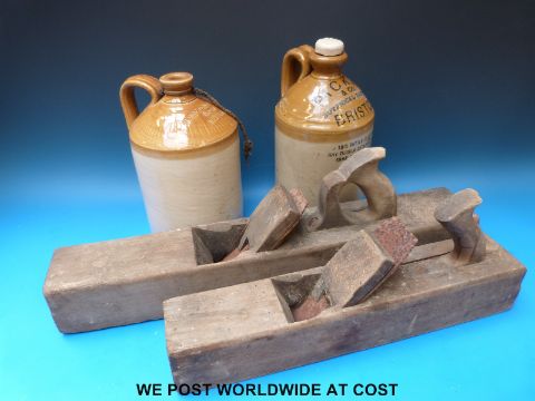 Two cider jars, Stroud and Bristol (local interest) together with two large wooden carpenters planes