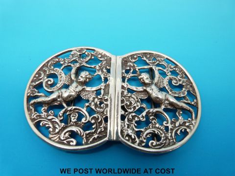 A hallmarked silver nurse's belt buckle with cherub decoration