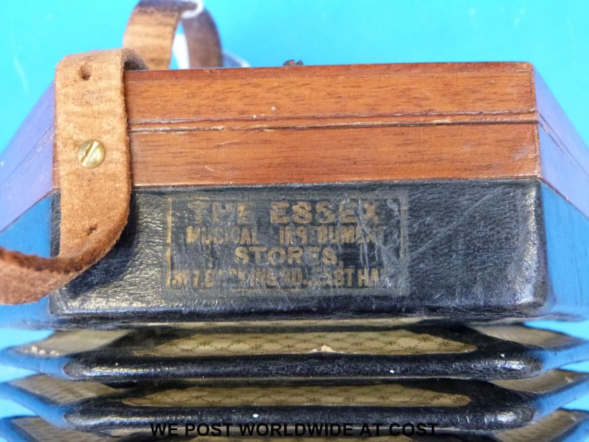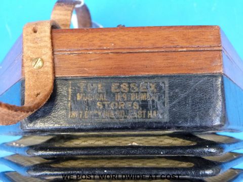 A c1900 30-key Anglo concertina with wooden fretworked ends, steel reeds, bone buttons and five-fold bellows. Serial no 192235, handles impressed English made, label missing from treble end but looks to be by Louis Lachenal
