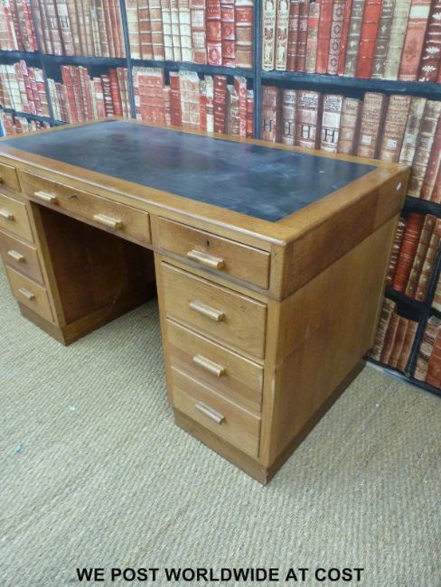 A light oak twin pedestal leather inset desk (H76 x L137 x D70cm)