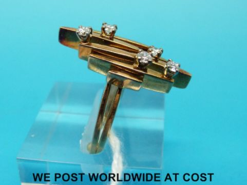 A yellow metal ring marked 750 set with five diamonds (size H)