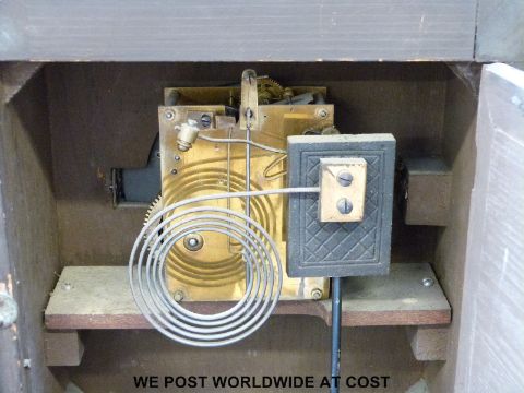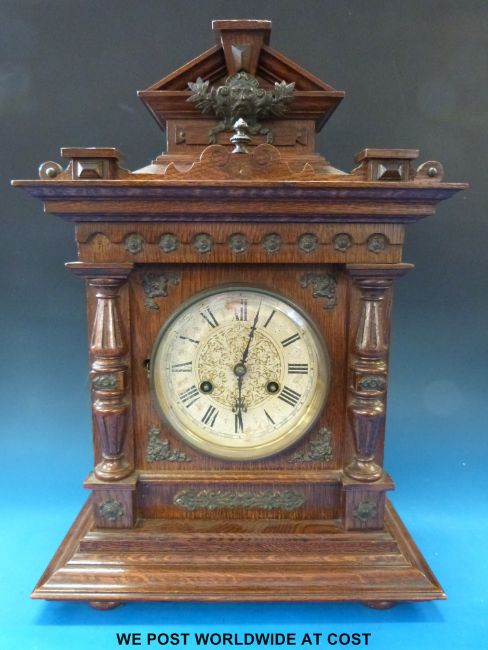 A continental two train clock with oak case, metal mask decoration, the Junghans movement striking on a gong, the etched dial with Roman movement and Beetle and Poker hands
