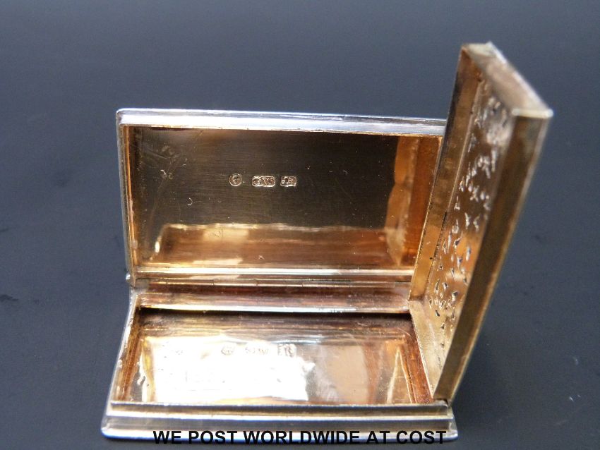 A Victorian hallmarked silver novelty vinagrette formed as a book with engraved decoration, gilt interior and pierced inner cover, Birmingham 1840 maker Gervase Wheeler, length 4.5cm (23g)