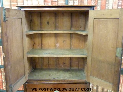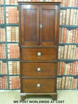 A 19thC mahogany cupboard over three drawers with lion mask loop handles raised on bracket feet (H163 x W66 x D29cm)