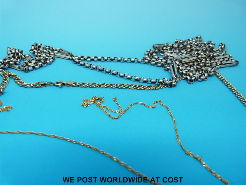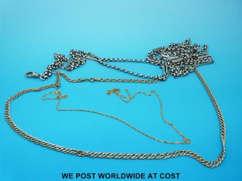 A gold necklace marked 375 (5.4g) a long white metal guard chain and a fine gold chain
