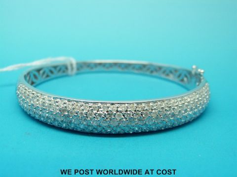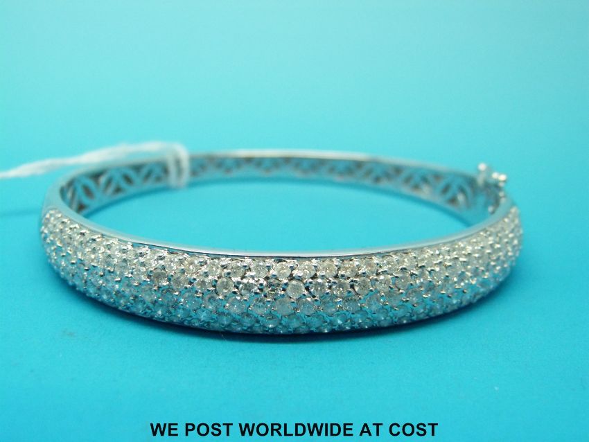 An 18ct white gold bangle, half set with five rows of round brilliant cut diamonds