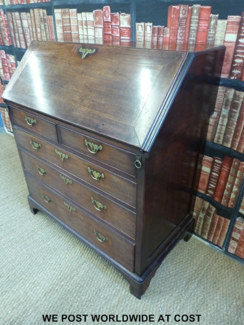 A George III mahogany bureau, the fall flap opening to reveal fitted interior with drawers, pigeon holes and secret compartment, the base fitted two over three drawers raised on bracket feet (H112 x W100 x D55cm)