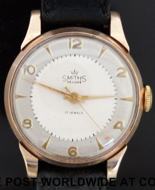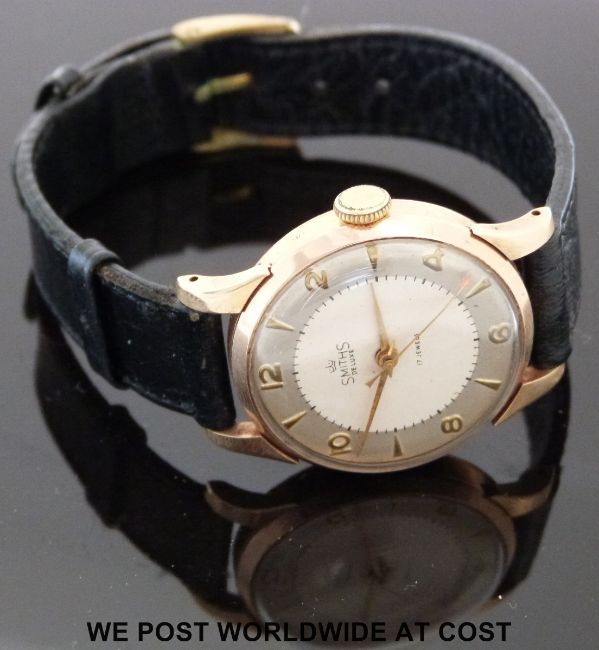 Smiths Deluxe 9ct gold gentleman's wristwatch with 17 jewel movement, gold hands and markers and two-tone face on black leather strap, case diameter 32mm, in original box with paperwork