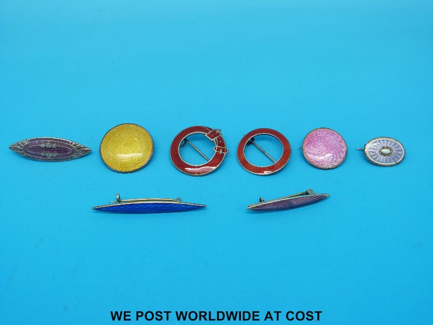 Six silver brooches set with enamel and two hallmarked silver brooches set with guilloche enamel by JA&S.