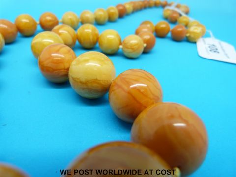 An amber necklace consisting of 49 graduated spherical beads, the largest 28mm in diameter, the smallest 10mm in diameter, 84cm long (114g)