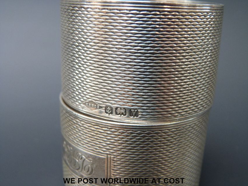 A pair of hallmarked silver napkin rings and a pair of silver sugar tongs, (weight 109g) together with a war service badge etc