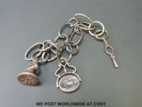 An 18thC cut steel chain made into a bracelet, with an articulated watch key and two fobs