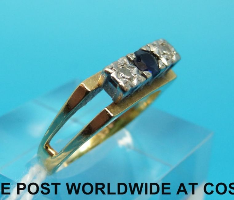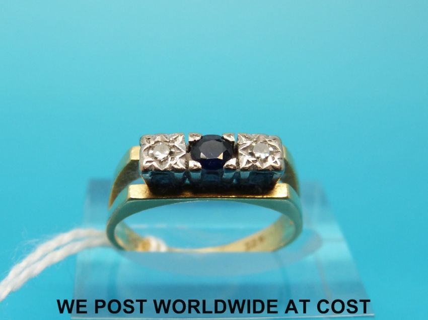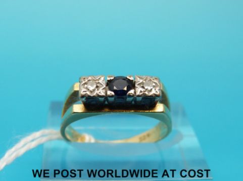 A yellow metal ring marked 18ct set with a sapphire flanked by diamonds (size J)