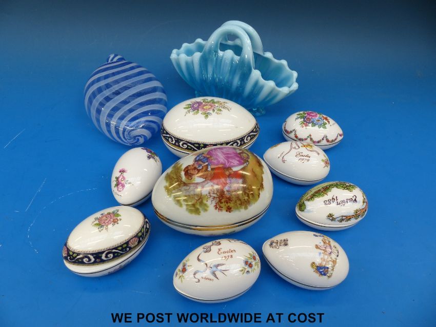 A wrythen glass bottle, Sowerby glass basket and a quantity of ceramic eggs