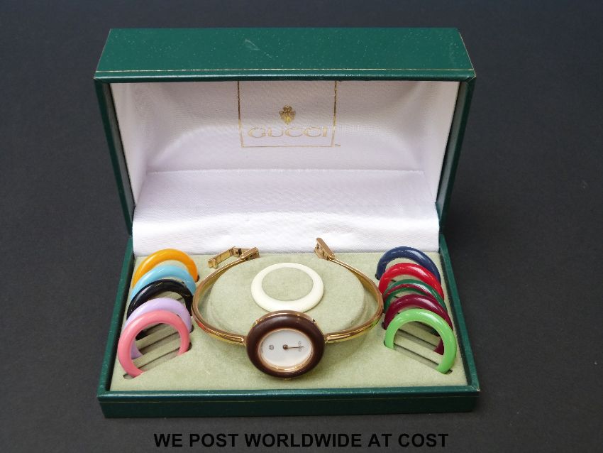 Gucci gold plated ladies wristwatch with 12 interchangeable bezels of various colours, case diameter 26mm, in original box.