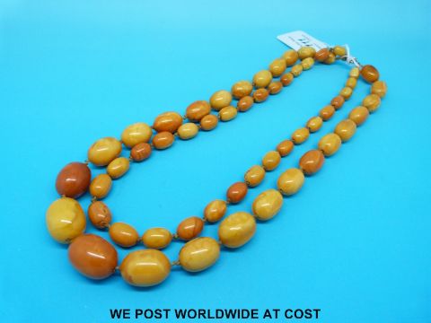 An amber necklace consisting of two strands of graduated ovoid beads, one strand with 31 beads the other with 26 beads, the largest 24 x 18mm, the smallest 11.4 x 7.7mm, total length 112cm (82g)