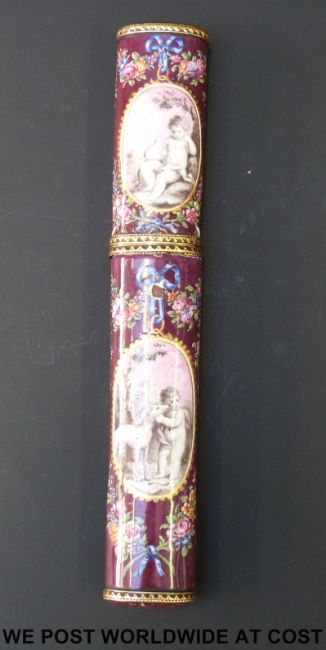 A late 18th / 19thC French enamel perfume bottle case of oval cylindrical form, decorated with four cartouches of cherubs, swags and flowers and with gilt / yellow metal mounts, 12cm tall