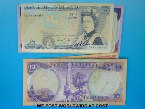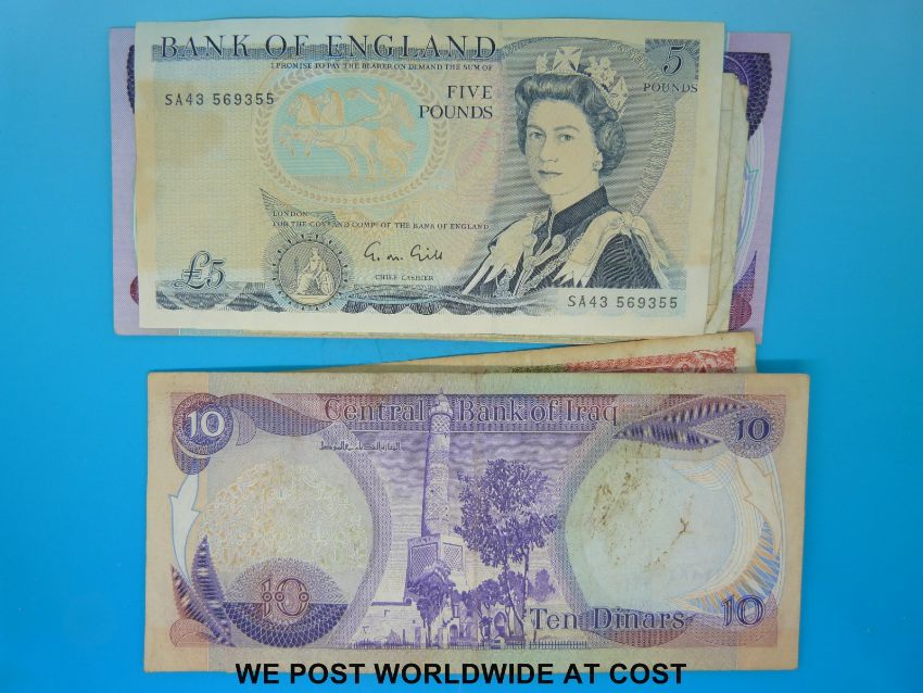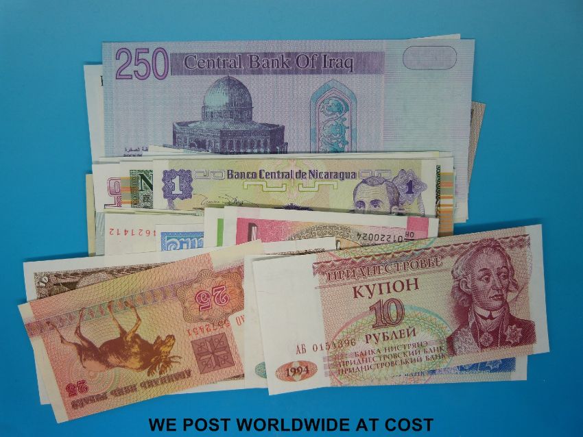 Approximately 52 world banknotes including UK, Oman, Kuwait, Rhodesia, Russia etc