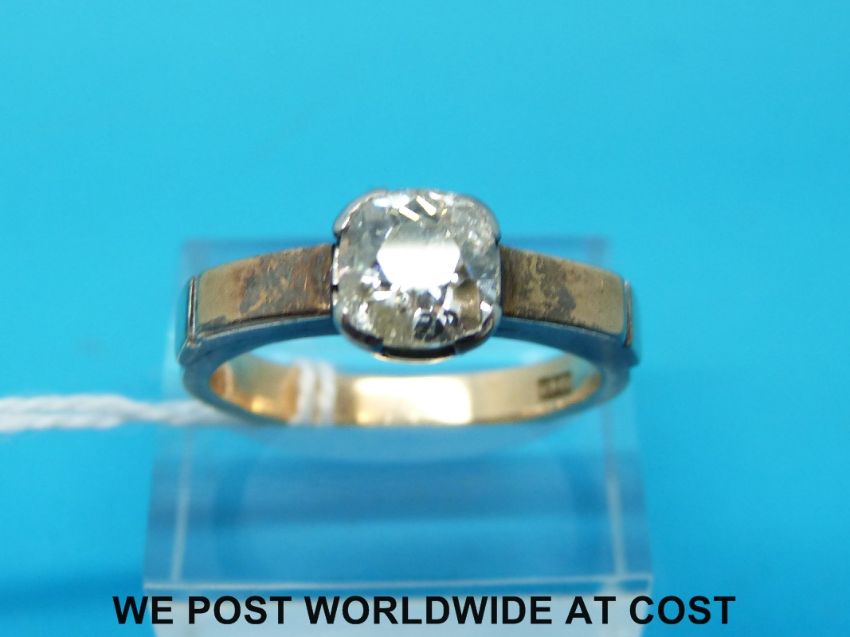 An 18ct gold ring set with a cushion cut diamond of approximately 1.28ct (size U)