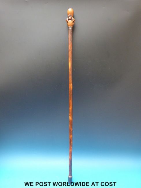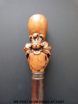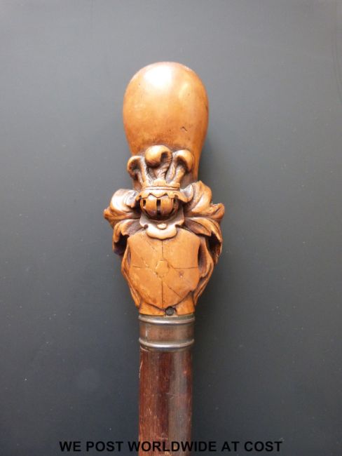 A possibly Chinese carved wood handled walking cane, the top with armorial shield and Prince of Wales feathers