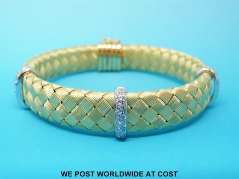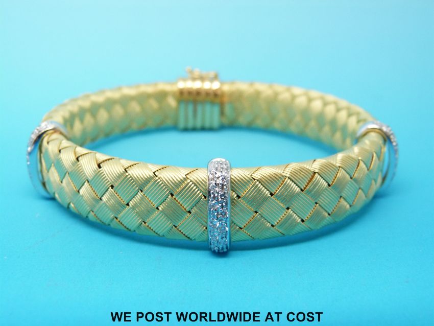 An 18ct gold bracelet of woven design with three white gold diamond set bands, the clasp set with a round brilliant cut diamond