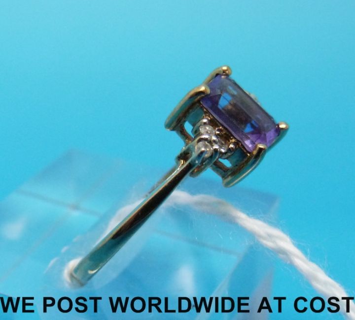 A 9ct gold ring set with an emerald cut amethyst and diamonds (size P)
