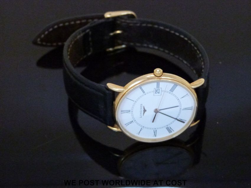 Longines Presence 18ct gold wristwatch with Roman numerals and date aperture on white face, on original black leather strap, marked to the back of the case '750 L4 743 6, 34124315', case diameter 32mm, in original box with international warranty booklet and card.