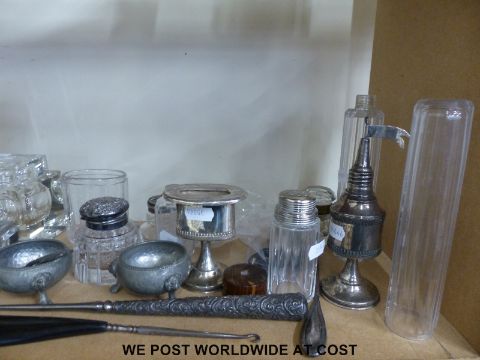 Hallmarked silver-mounted glass items, together with further white metal marked 925 and a quantity of glass inkwells, pots etc