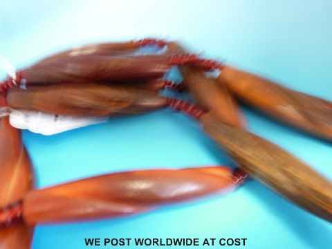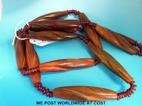 A rhinoceros horn necklace consisting of 12 carved elongated rhino horn beads with twisted decoration, each 80 x 20mm, interspersed with red glass beads (229g)