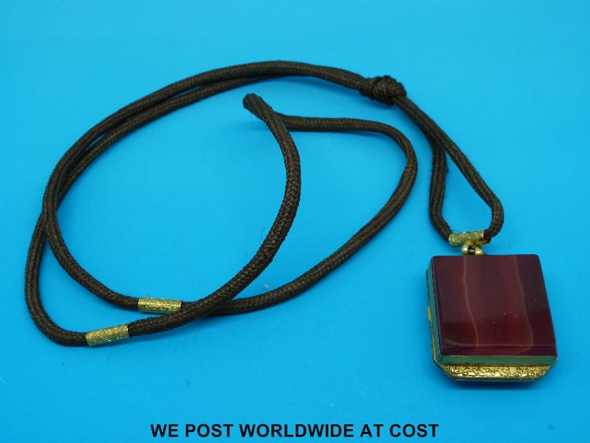 A 19thC gilt and agate vinaigrette, possibly Scottish, on braided hair necklace and matching gilt mounts, 4 x 3.5cm, overall 50cm