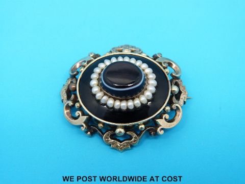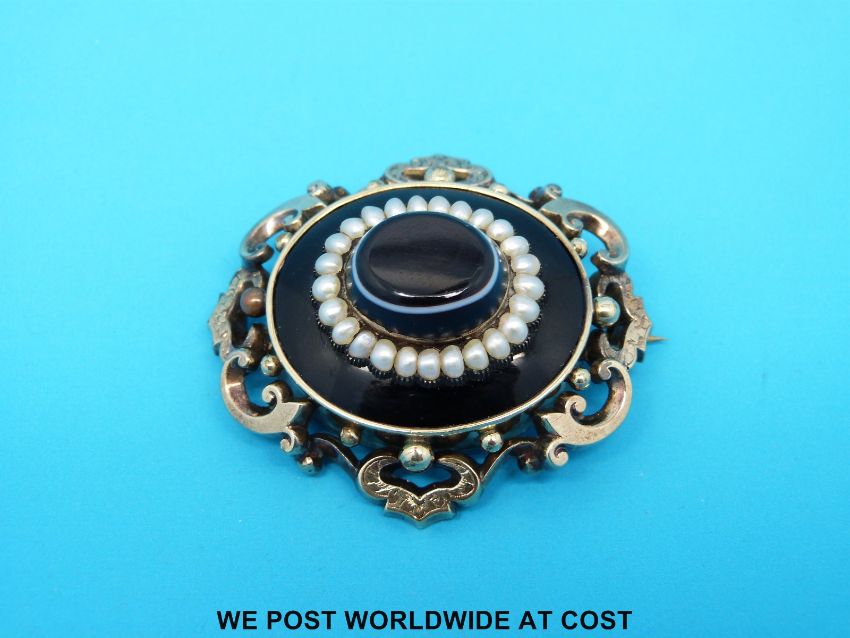 A Victorian mourning brooch set with banded agate, pearls and a foliate border, engraved 1849