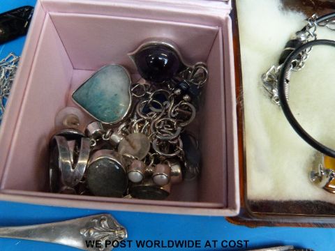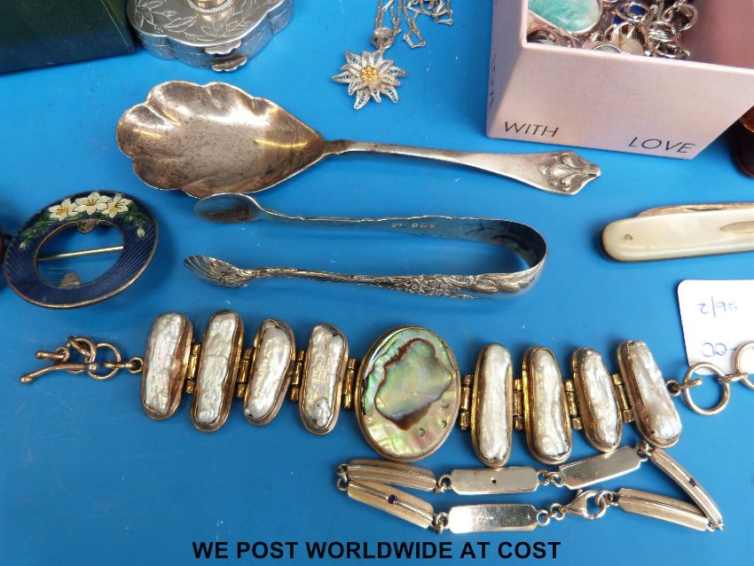 A quantity of silver jewellery to include bracelets, rings, pendants, jet mourning brooch and a quantity of costume jewellery, silver tongs and spoon