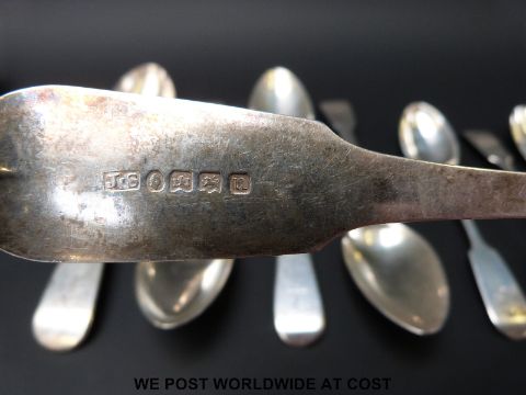 A quantity of Georgian and early Victorian hallmarked silver fiddle pattern cutlery to include two table spoons, four dessert spoons, ten teaspoons and a pair of sugar tongs (553g)