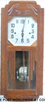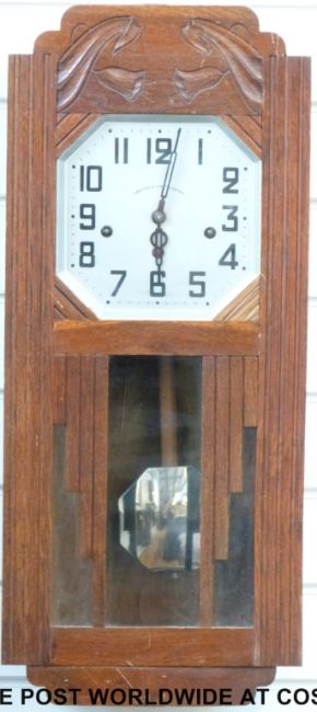 A three train Art Deco wall clock with Westminster chime on eight rods, octagonal face circa 1930's complete with pendulum and key, the face marked Veritable Westminster