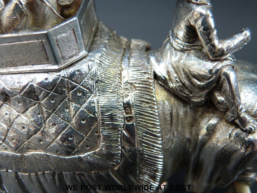 A Victorian hallmarked silver novelty inkwell formed as an elephant transporting a gentleman with servant behind holding shade and further man atop the elephant, the central figure swivelling to one side to reveal the silver mounted glass inkwell. London 1859 maker George Angell & Co, weight of elephant removed from base 594g, length of elephant 13.5cm, height on base 14cm