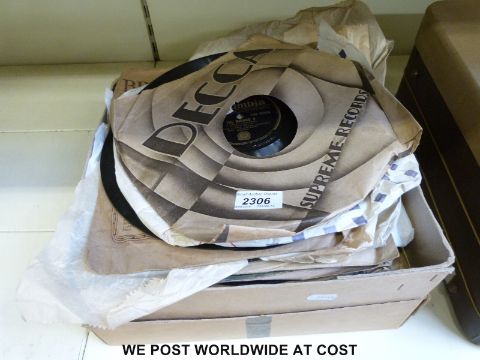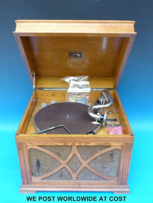 A H.M.V light oak cased gramophone with brush on the reproducer, internal horn and a collection of needle tins and records.