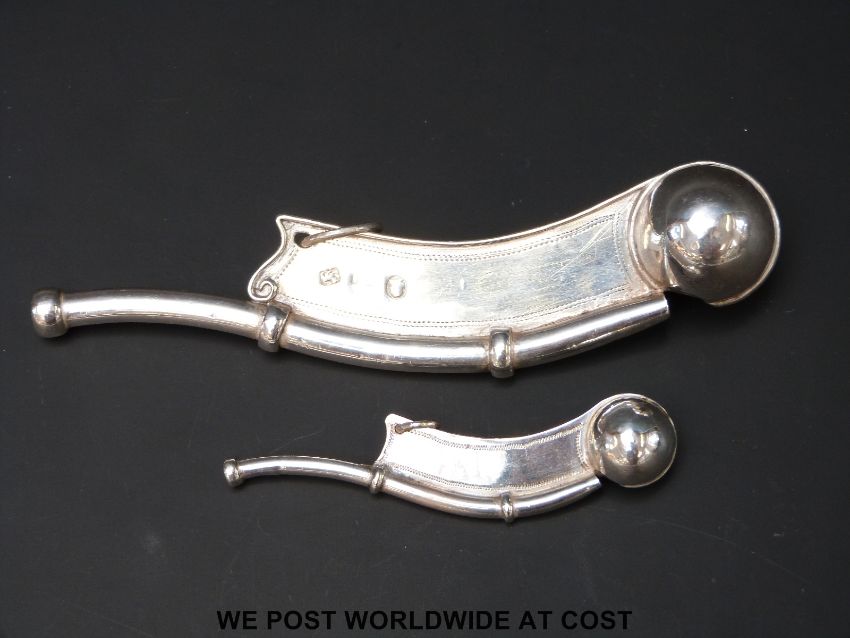 A 19th century hallmarked silver bosuns whistle, marks rubbed, length 12cm (28g)together with a further smaller bosun's whistle