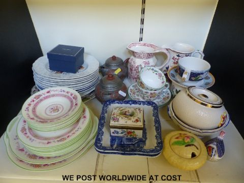 A collection of ceramics to include 1930's Royal Doulton, George Jones Abbey, Minton 'Haddon Hall', Crown Derby paperweight, 19thC blue and white plates