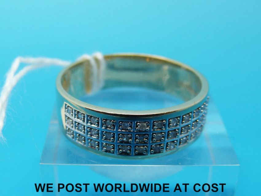 A 9ct gold gents ring set with three rows of diamonds (size V/W)