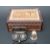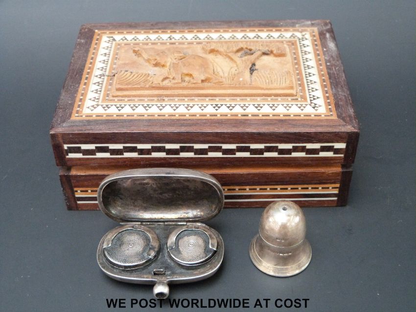 A silver sovereign case and half sovereign (B'ham 1913) together with a hallmarked small silver salt (1964) in a small carved Indian box