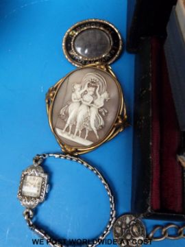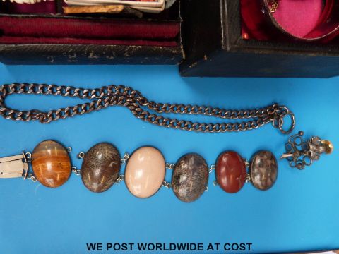 A vintage jewellery box, mourning brooch, agate bracelet, coral beads, marcasite watch etc