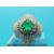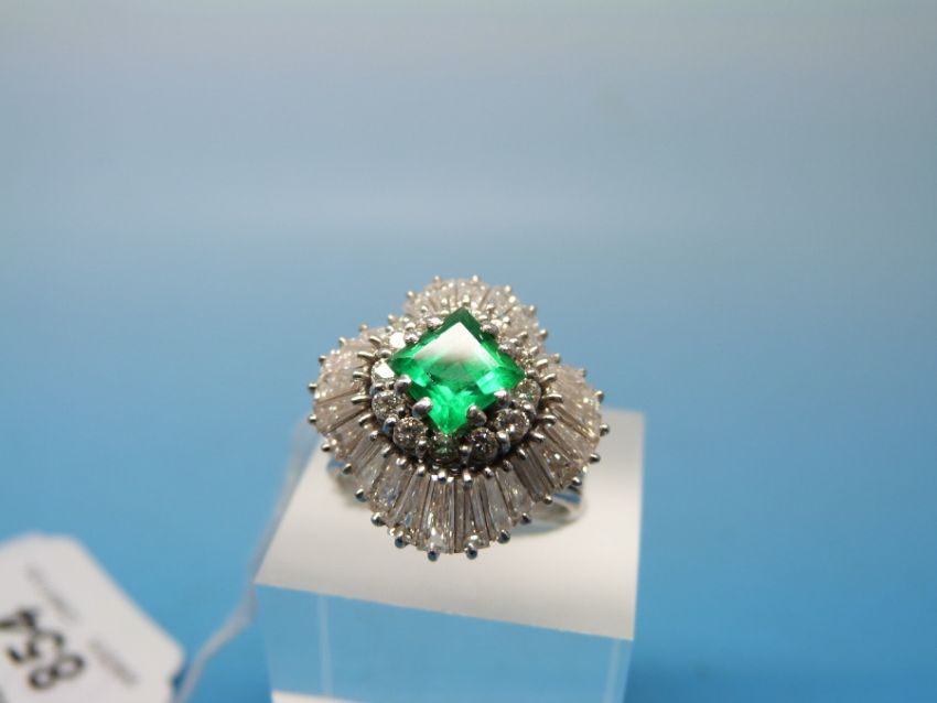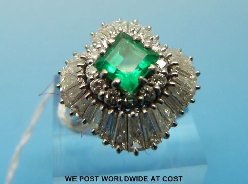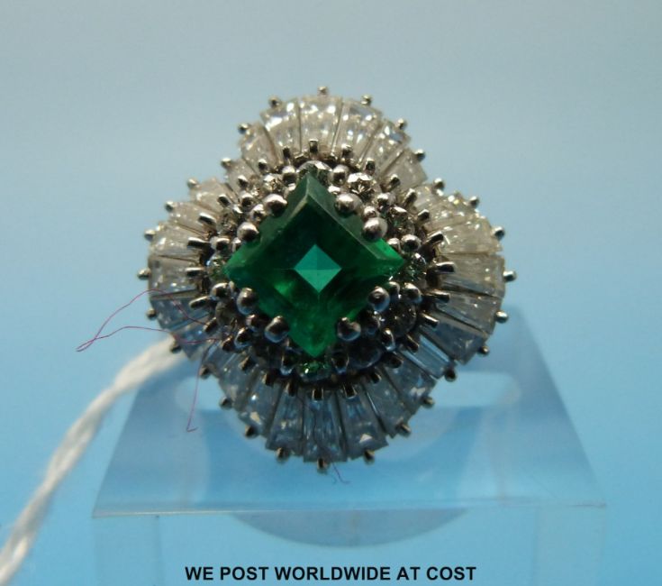 A white metal ballerina ring set with a square emerald measuring approx 1.2ct surrounded by round brilliant cut diamonds and a further row of baguette cut diamonds (size P)