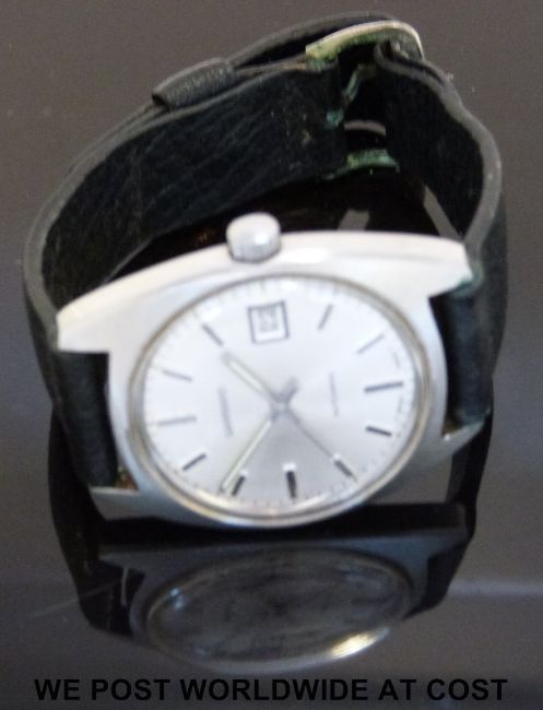 Garrard gentleman's automatic wristwatch with date aperture, luminous hands and baton markers, in stainless steel case, on black leather strap, case size, 34x4mm.