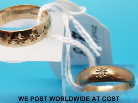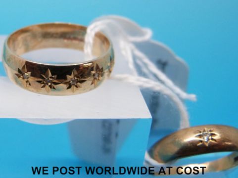 Two 9ct gold rings, one set with a diamond in a star setting and the other a row of diamonds in star settings