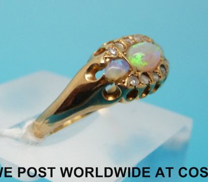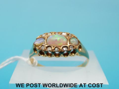 An 18ct gold ring set with three opals and old cut diamonds, (size P)